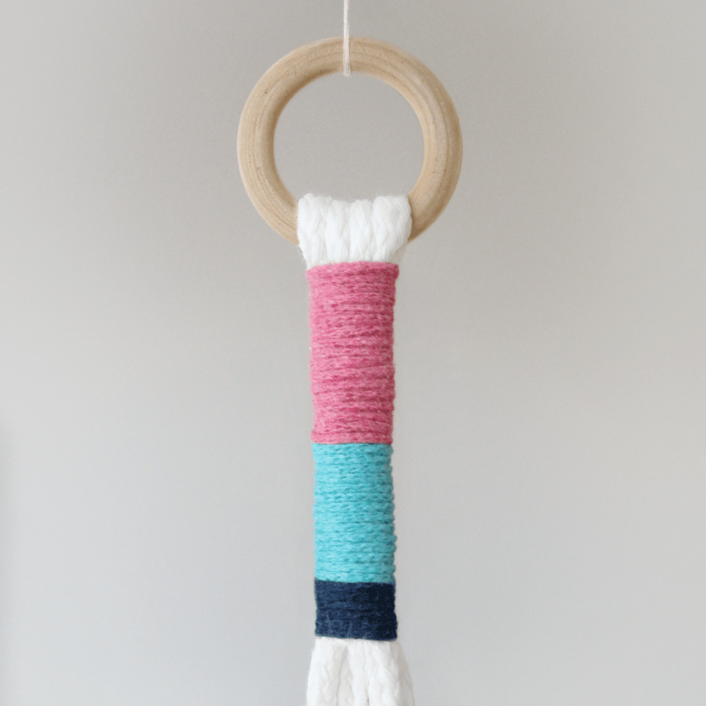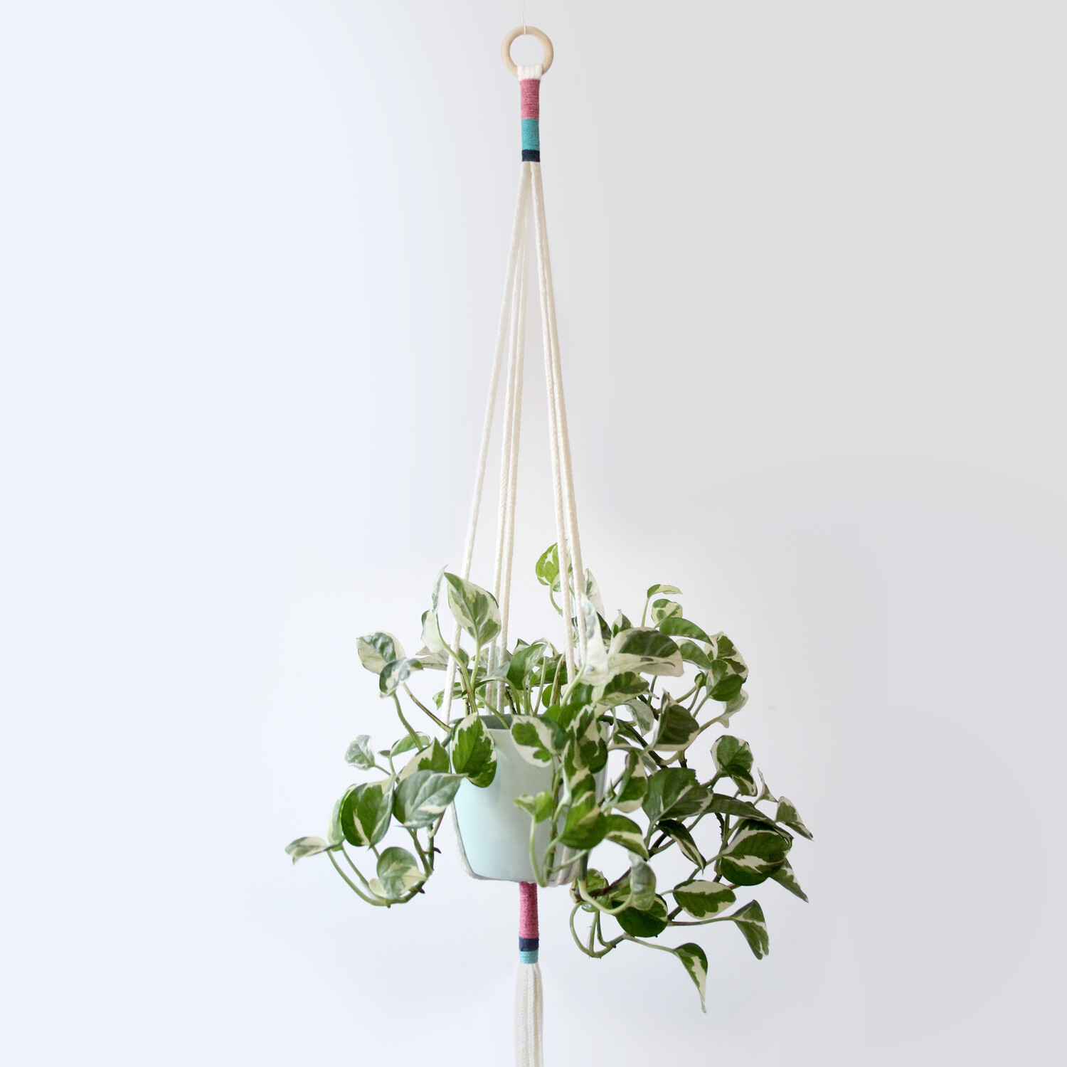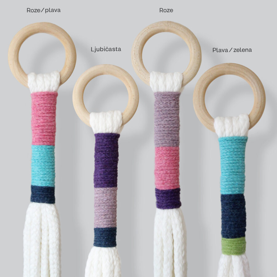 Fjorir visilice za saksije u osnovi čini debelo pamučno uže i tanji pamučni kanapi u bojama raspoređenim po blokovima. Svaki komad je jedinstven. Ne dolazi sa saksijom ili biljkom. Izrađuje se po porudžbini i isporučuje u roku od 4-6 dana.